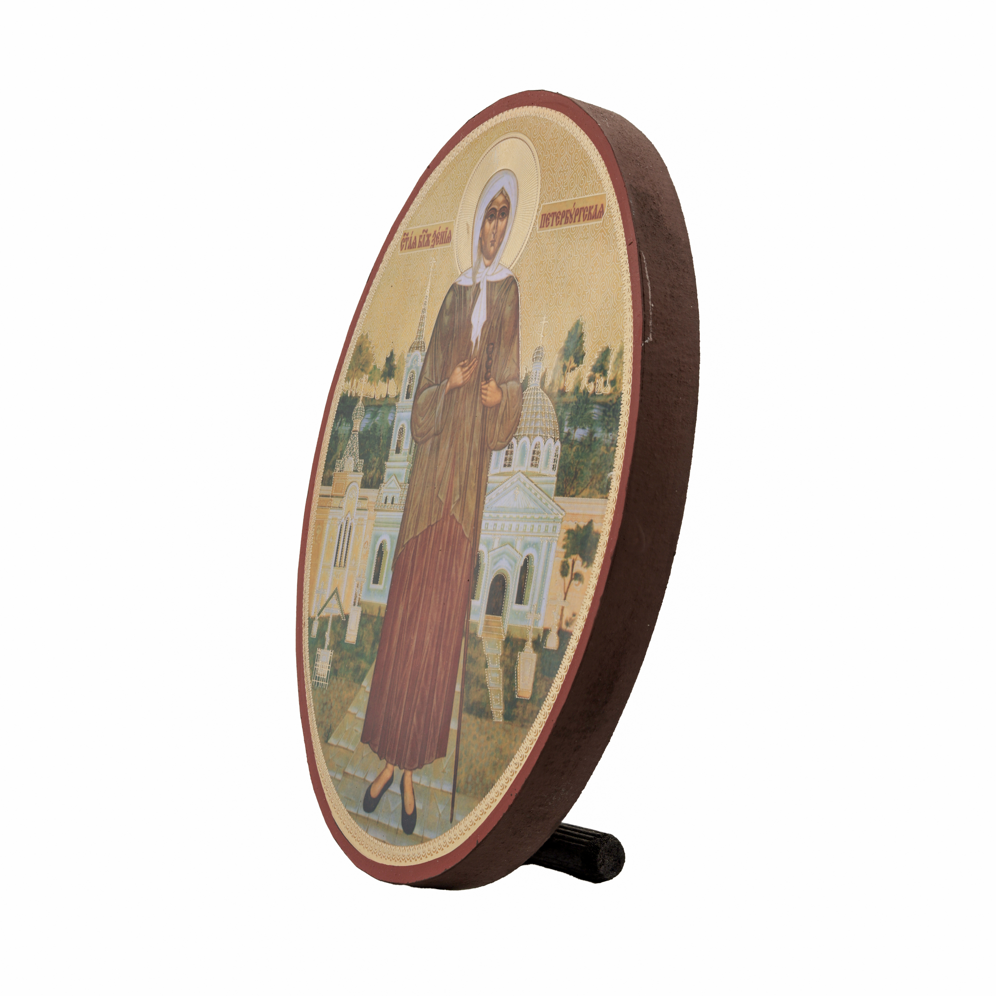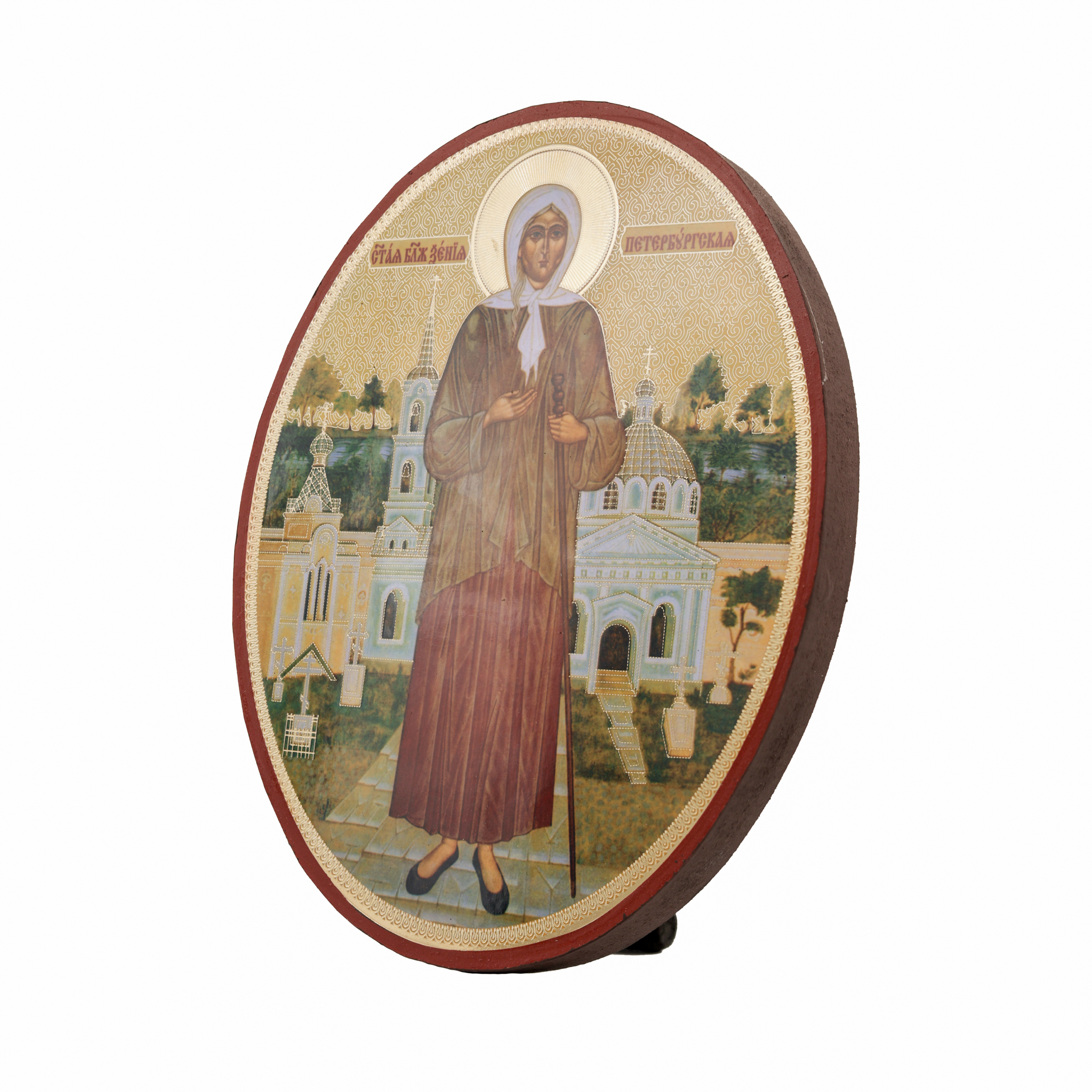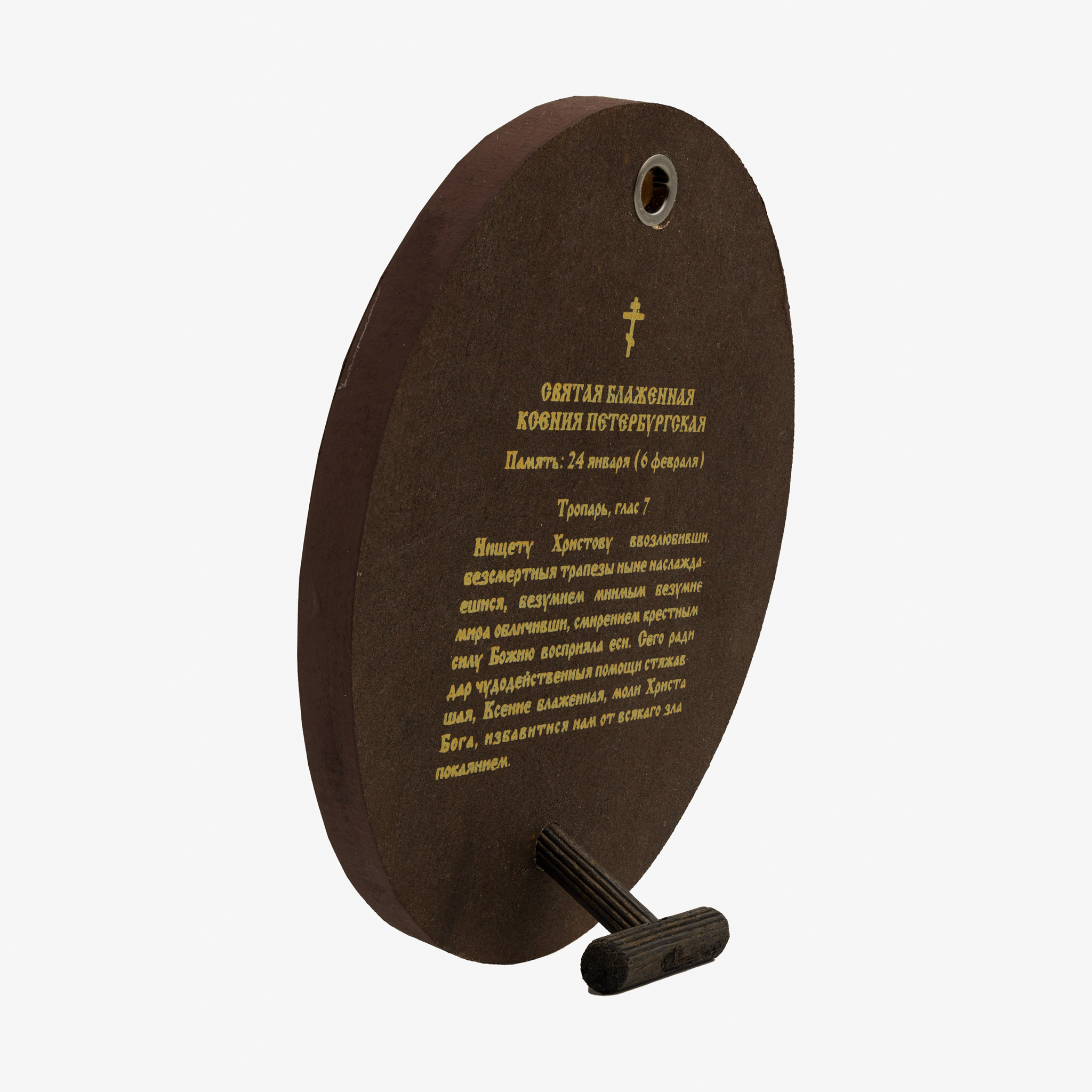 Икона выполнена из дерева, на оборотной стороне написан текст тропаря святой блаженной Ксении Петербургской и имеется отверстие для крепления на стену и подставка, чтобы установить образ на стол.