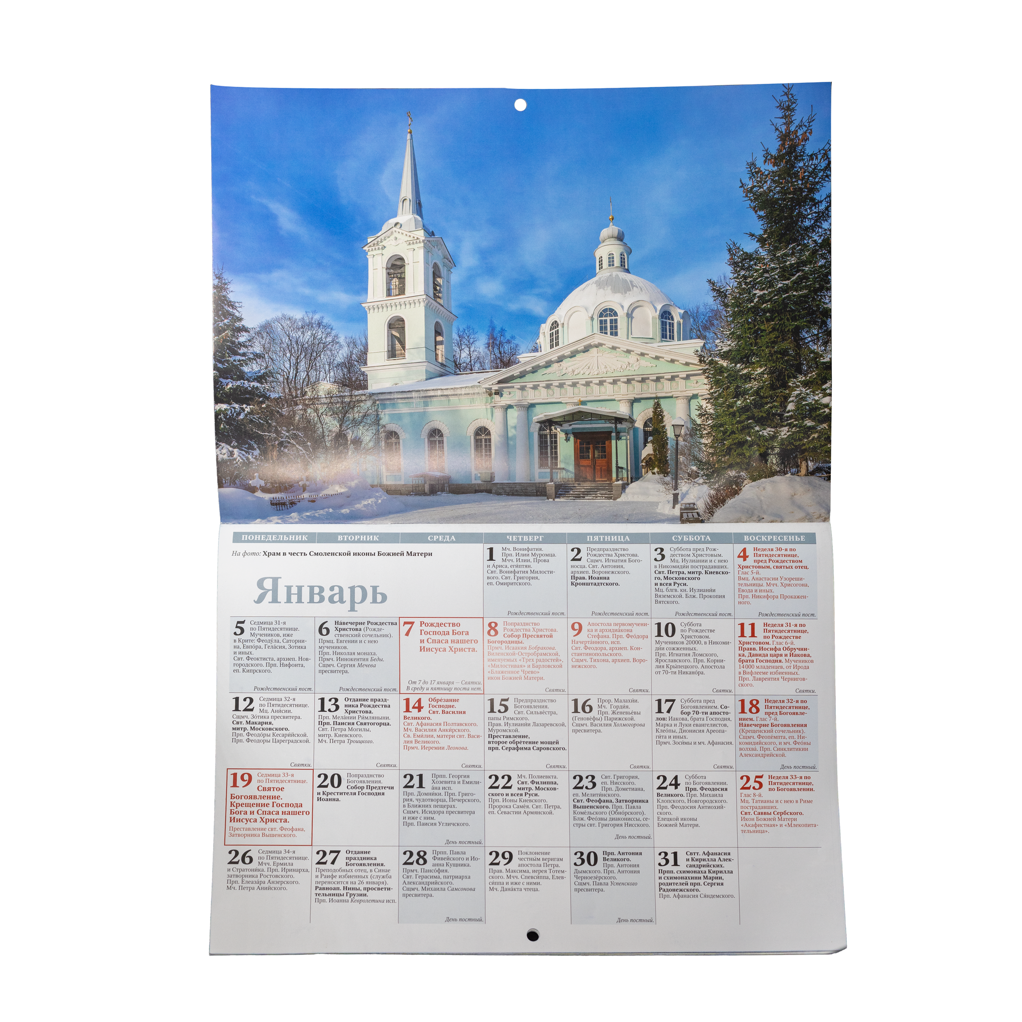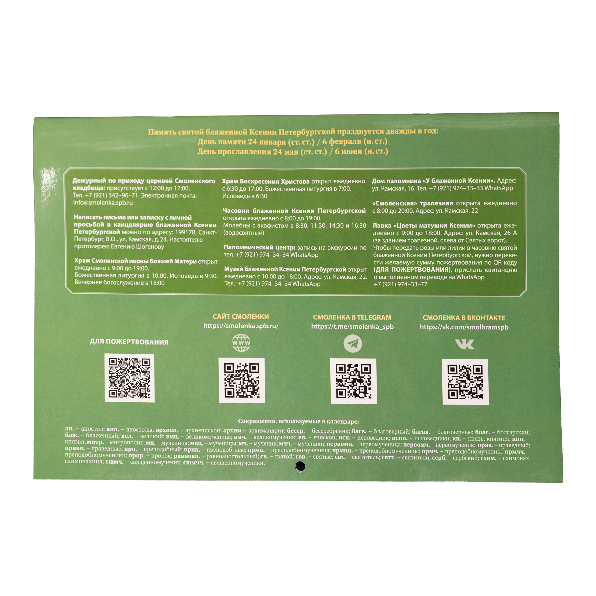 В календаре расписаны дни памяти святых и праздники церковного года. Есть расписание молебнов в часовне блаженной Ксении и богослужений в Смоленском и Воскресенском храмах.